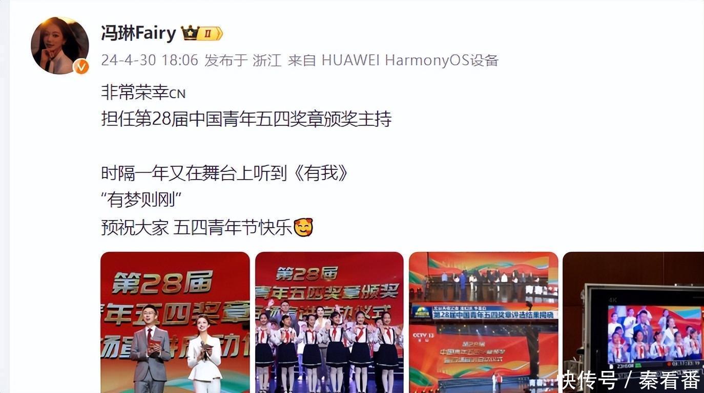 值得一提的是在2024年4月29号晚播出的《新闻联播》节目中也对《第28届中国后生五四奖章受奖暨百场宣讲运转典礼》进行了报说念,其中《新闻联播》节目还给了冯琳一个镜头,值得一提的是,这次冯琳出现时《新闻联播》节目亦然继前年她在中央播送电视总台2023主合手东说念主大赛上喜提铜奖之后时隔127天首秀央视。