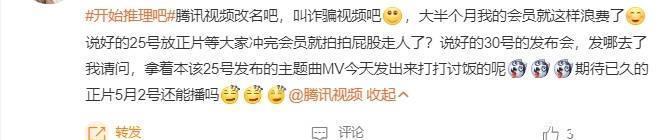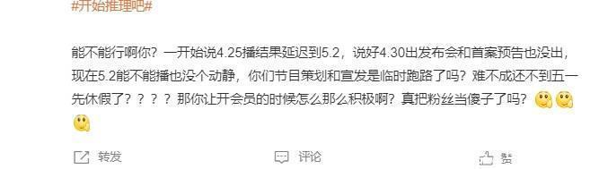 按照粉丝的说法,《初始推理吧2》一初始酌量的是在25日召成立布会,认真为节目开播预热,与此同期会曝光首期预报和主题曲MV,可是目下已过程去了近一周时分,非但莫得比及节目定档,反倒连新的宣传物料都莫得看到,何况节目组一再将时分推迟也莫得任何阐扬,如斯莫得打法的作念法引起了群愤。